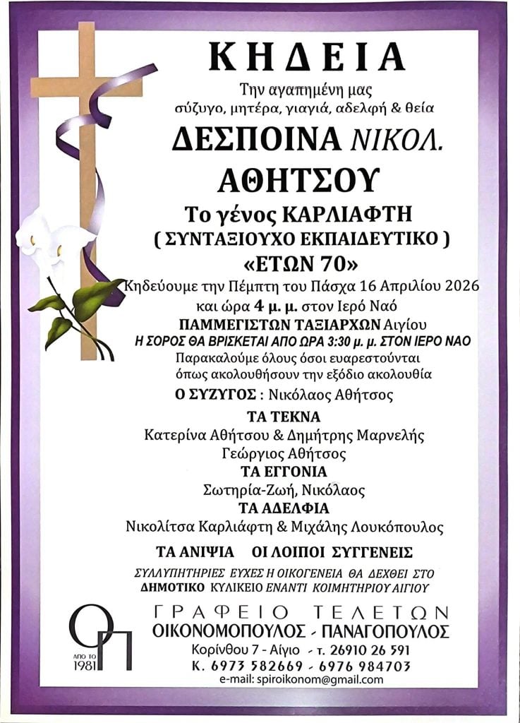 ΥΓΕΙΑ Αχαΐα: Θλίψη για το θάνατο συνταξιούχου εκπαιδευτικού 4 hours ago1 Min Read Add Comment Share This! FacebookTwitter This post was originally published on this siteΚΗΔΕΙΑ Home News You may also like Ιωάννινα: Οδηγούσε ενώ του είχε αφαιρεθεί το δίπλωμα για 5 χρόνια! 3 hours ago Πάτρα: Εκδήλωση του Μορφωτικού Συλλόγου Ελληνίδων Κυριών 3 hours ago Θέλει Μουζακίτη η Γιουβέντους: «Ο Κιελίνι διαπραγματεύεται για το ελληνικό διαμάντι» 4 hours ago Add Comment Click here to post a comment Cancel reply CommentName * Email * Website This site uses Akismet to reduce spam. Learn how your comment data is processed. Αφράτα κεφτεδάκια τόνου Καλάβρυτα: Την επόμενη εβδομάδα η δράση «η Τρίτη Ηλικία στην εποχή της Τεχνολογίας» Comment Share This! FacebookTwitter