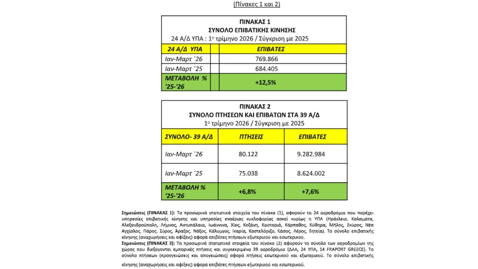 Αύξηση καταγράφηκε και στο σύνολο των 39 αεροδρομίων της χώρας, που εξυπηρετούν εμπορικές πτήσεις, συμπεριλαμβανομένων των αεροδρομίων της ΥΠΑ, της Fraport Greece και του Διεθνούς Αερολιμένα Αθηνών. Η συνολική επιβατική κίνηση αυξήθηκε κατά 7,6% το α’  τρίμηνο του 2026, φτάνοντας τους 9.282.984 επιβάτες, έναντι 8.624.002 το 2025.