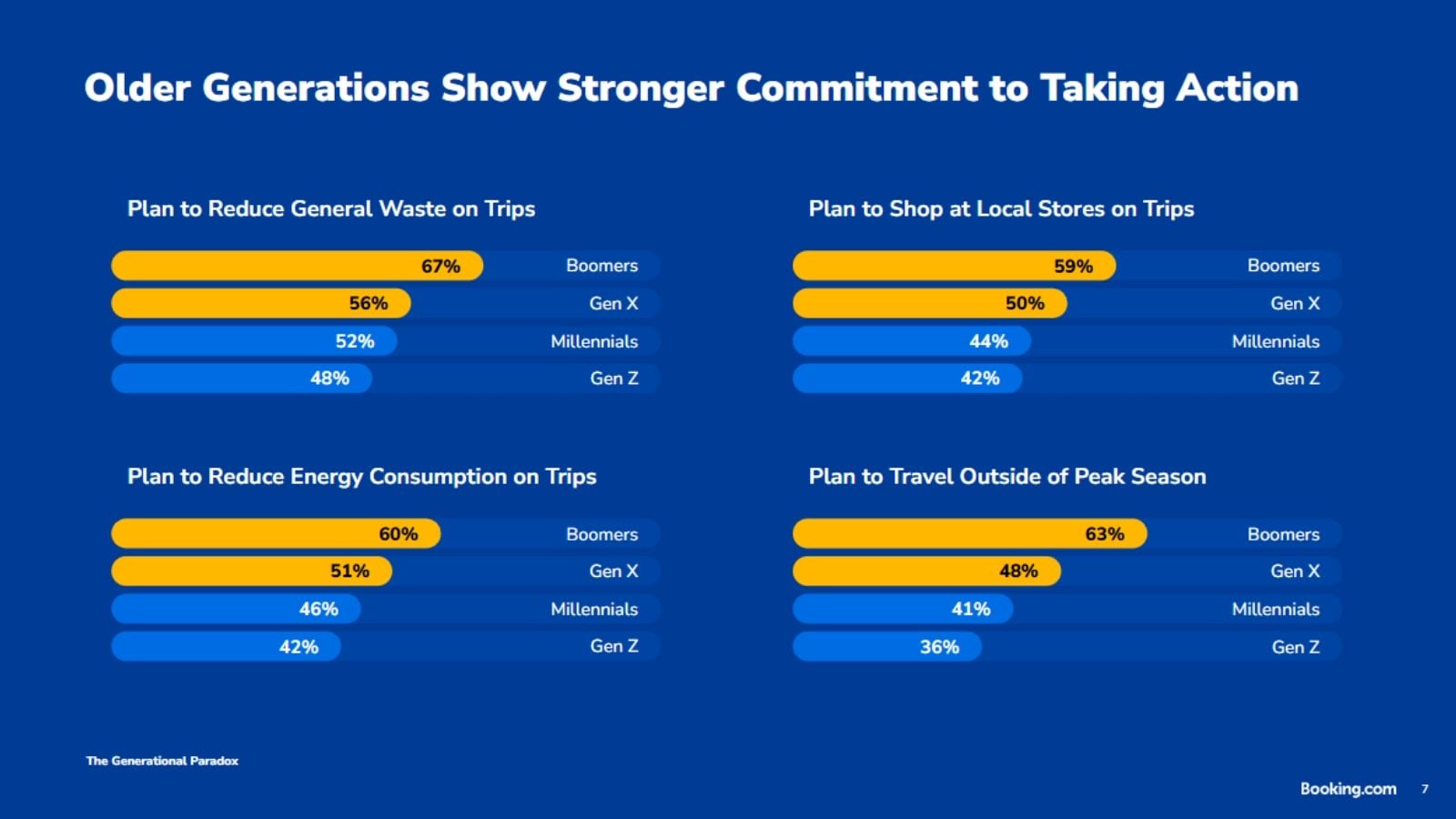 Από όσους σκοπεύουν να ταξιδέψουν με πιο βιώσιμο τρόπο μέσα στο επόμενο έτος, το 67% των Baby Boomers δηλώνει ότι θα μειώσει τα γενικά απορρίμματα κατά τη διάρκεια του ταξιδιού, έναντι 56% της γενιάς Χ, 52% των Millennials και 48% της γενιάς Ζ. Αντίστοιχα, το 60% των Baby Boomers δηλώνει ότι θα μειώσει την κατανάλωση ενέργειας, έναντι 51% της γενιάς Χ, 46% των Millennials και 42% της γενιάς Ζ.