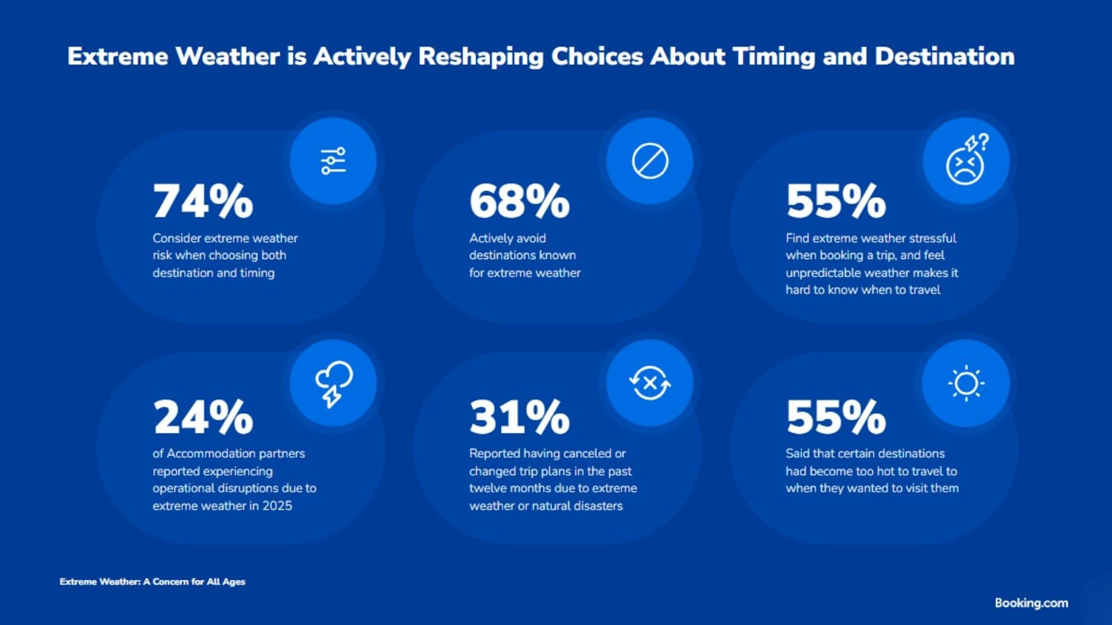 Η έκθεση αναδεικνύει παράλληλα τα ακραία καιρικά φαινόμενα ως κοινό παράγοντα που επηρεάζει όλες τις ηλικίες. Σε παγκόσμιο επίπεδο, σχεδόν τα 3/4 των ταξιδιωτών, σε ποσοστό 74%, δηλώνουν ότι λαμβάνουν υπόψη τον κίνδυνο ακραίων καιρικών φαινομένων τόσο κατά την επιλογή προορισμού όσο και κατά την επιλογή της χρονικής περιόδου του ταξιδιού, ενώ στην Ελλάδα το αντίστοιχο ποσοστό διαμορφώνεται στο 66%.
