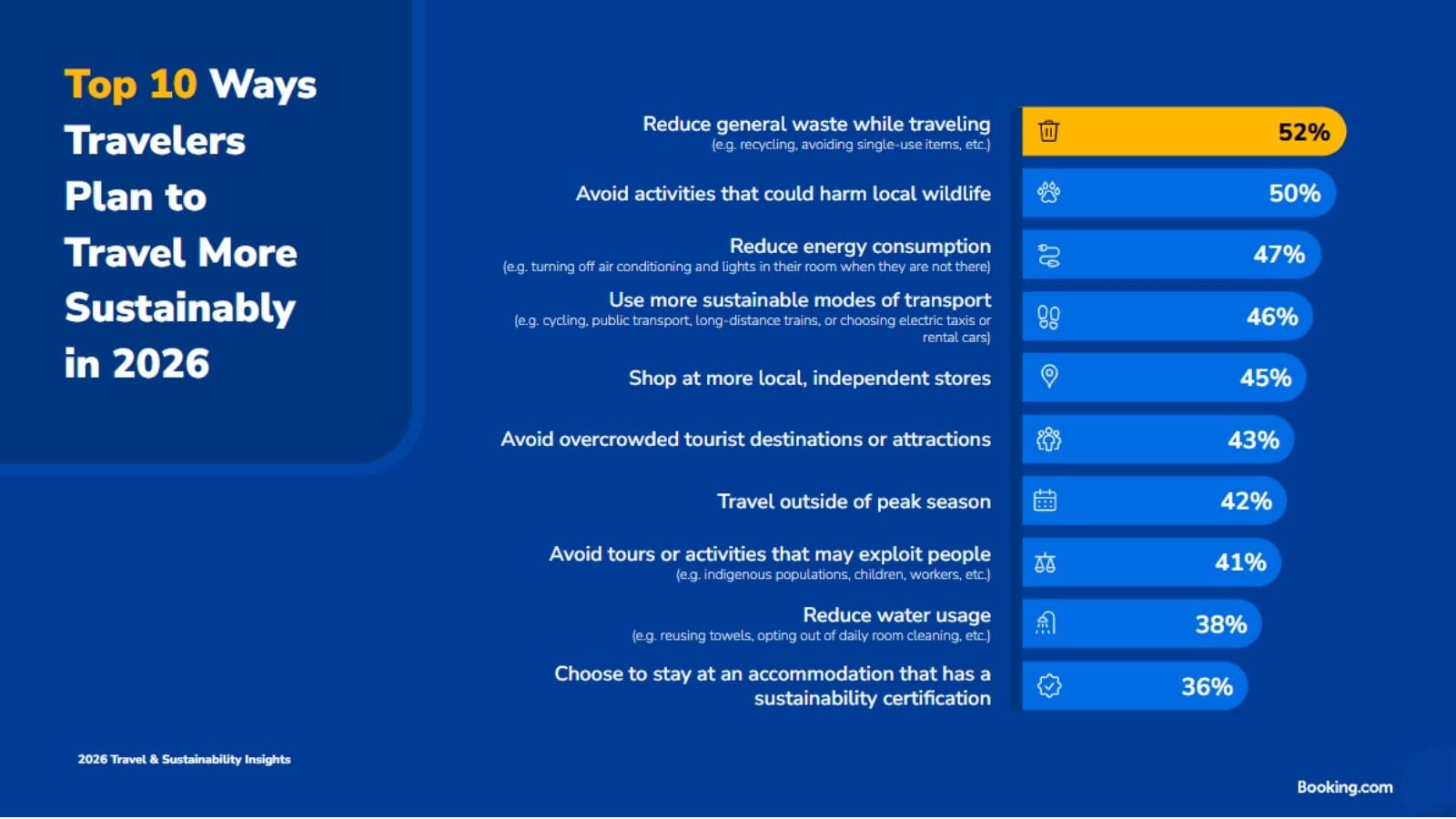 Η Danielle D’Silva, διευθύντρια Βιωσιμότητας της Booking.com, δηλώνει: “Η φετινή Έκθεση για τα Ταξίδια και τη Βιωσιμότητα δείχνει ότι, μπορεί οι διαφορετικές γενιές να έχουν διαφορετική αντίληψη για το τι συνιστά πιο βιώσιμο ταξίδι, ωστόσο η προσαρμογή στις ακραίες καιρικές συνθήκες και η ενεργή αποφυγή των συνωστισμών αποτελούν πλέον κανόνα σε όλες τις ηλικίες. Είναι ενθαρρυντικό να βλέπουμε ένα ευρύ φάσμα τρόπων με τους οποίους οι ταξιδιώτες ήδη ταξιδεύουν με πιο βιώσιμο τρόπο, καθώς και την πρόθεσή τους να συνεχίσουν σε αυτή την κατεύθυνση. Είτε αφορά στα 100 εκατομμύρια διανυκτερεύσεις που έκλεισαν οι ταξιδιώτες το 2025 σε συνεργαζόμενα καταλύματα με πιστοποίηση βιωσιμότητας από τρίτο φορέα στην πλατφόρμα μας είτε στη χρήση των μέσων μαζικής μεταφοράς ή στην ενοικίαση ηλεκτρικού οχήματος για τις μετακινήσεις τους κατά τη διάρκεια των ταξιδιών τους είτε την επιλογή πιο δροσερών και πιο ήσυχων προορισμών. Ως παγκόσμιος ηγέτης στον τομέα των ταξιδιών, θέλουμε να διευκολύνουμε τόσο τους ταξιδιώτες όσο και τους συνεργάτες μας να συνεχίσουν να λαμβάνουν αυτές τις πιο βιώσιμες επιλογές, ούτως ώστε όλοι να μπορούν να συνεχίσουν να απολαμβάνουν τα οφέλη που προσφέρουν τα ταξίδια και να συνεχίσουν οι προορισμοί να παραμένουν ευχάριστοι τόσο από τους επισκέπτες όσο και από τους κατοίκους”.